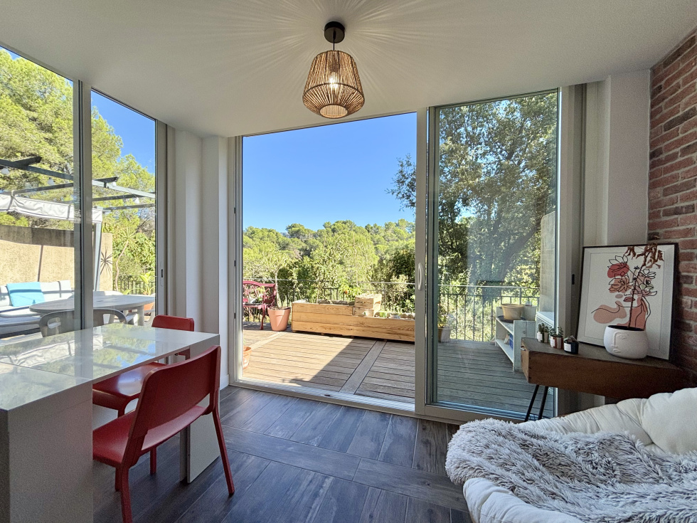 Terrasse fermée prolongeant le séjour et s'ouvrant directement sur la terrasse