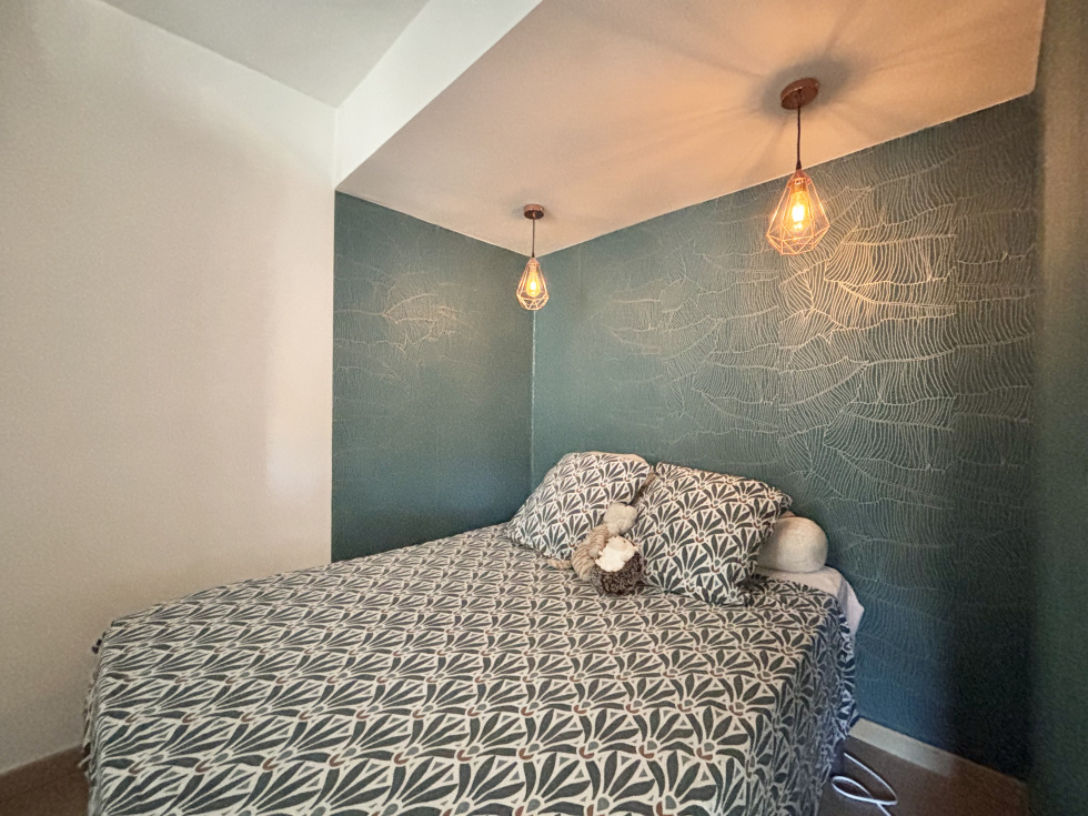 - Une chambre, accessible depuis le séjour, disposant d’une fenêtre intérieure fixe laissant passer la lumière naturelle depuis la pièce principale.
