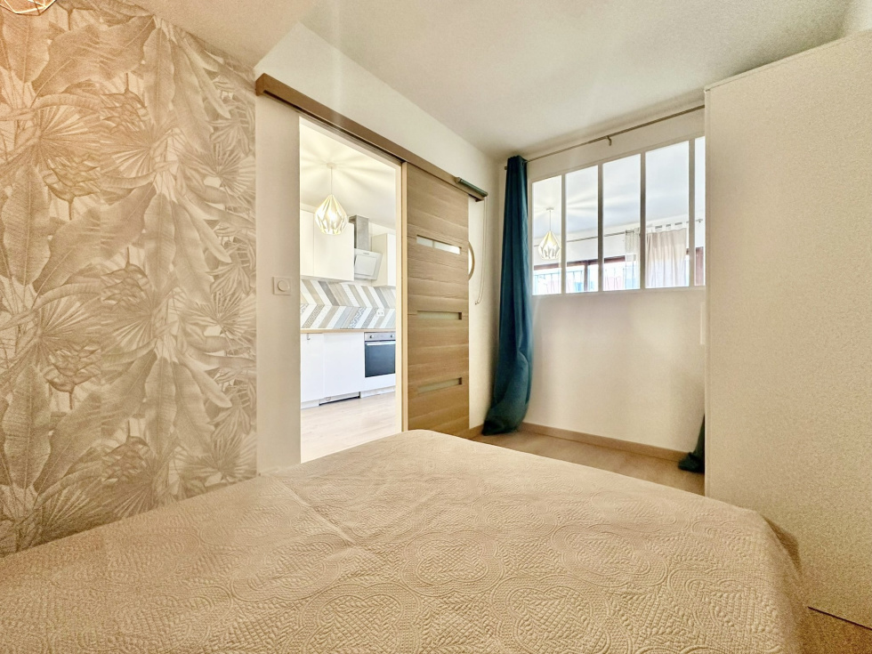 - Une chambre, accessible depuis le séjour, disposant d’une fenêtre intérieure fixe laissant passer la lumière naturelle depuis la pièce principale.