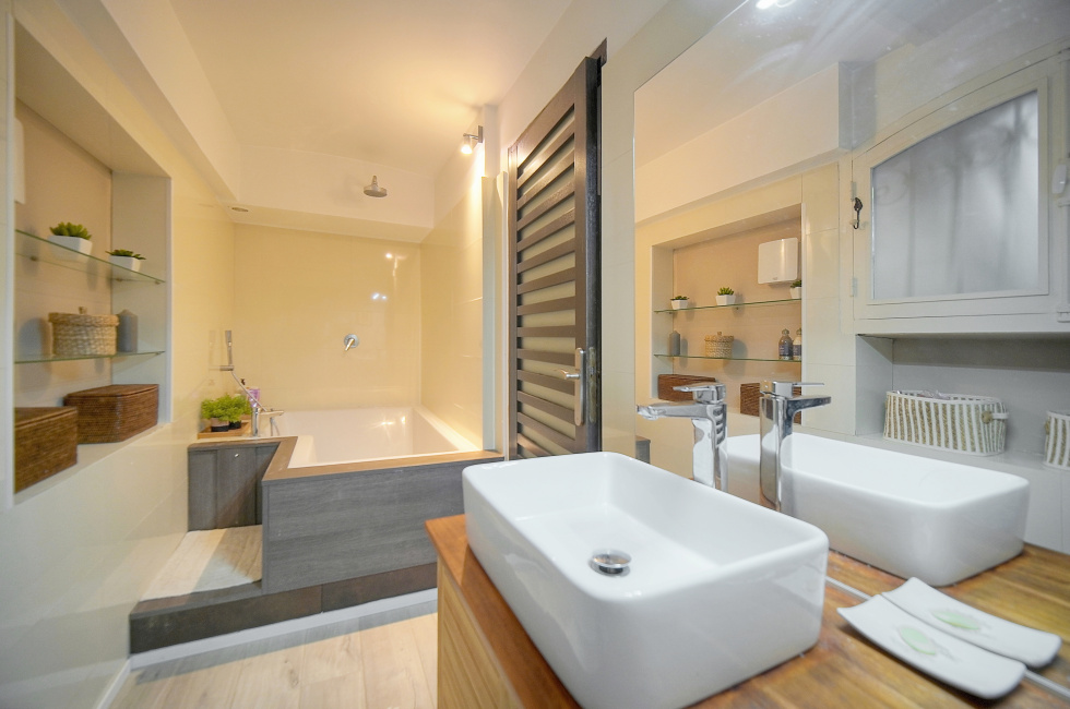 L’appartement offre une très belle hauteur sous plafond et de beaux volumes. Il se compose d’un séjour exposé plein Sud, lumineux, ouvrant sur une terrasse prolongée par un jardin avec jouissance privative, d’une salle à manger avec cheminée et d’une cuisine indépendante. L’espace nuit se répartit sur les niveaux, avec une chambre en rez-de-jardin et une chambre à l’étage, chacune disposant de sa salle d’eau avec WC. Le bien est entièrement climatisé et bénéficie d’un agencement atypique et recherché en triplex, sans aucune nuisance sonore.