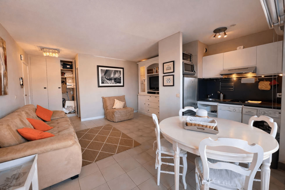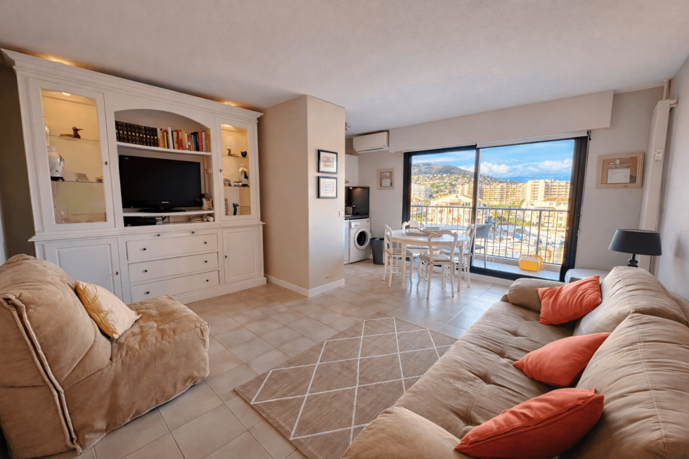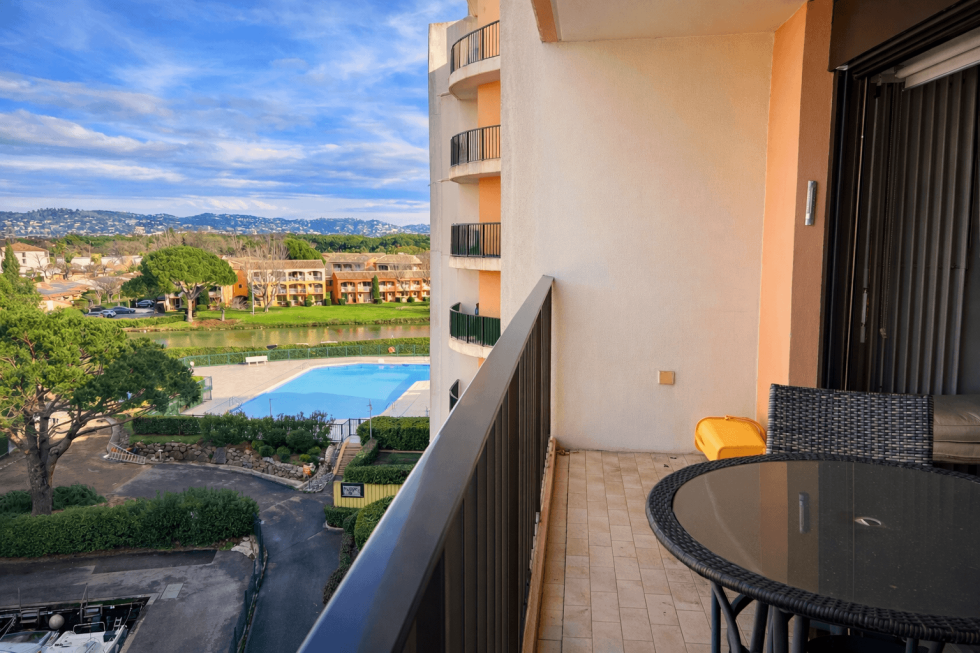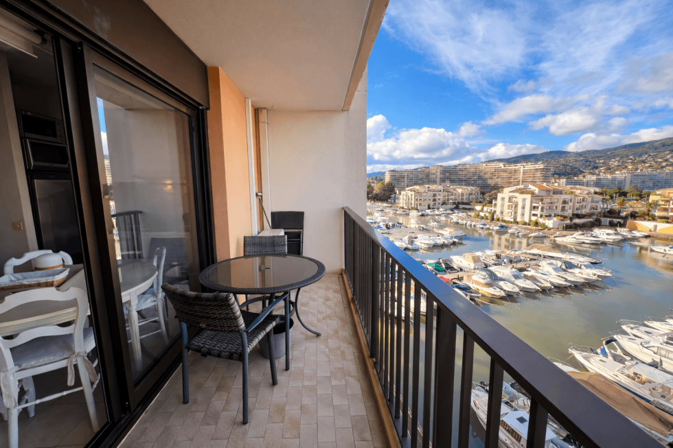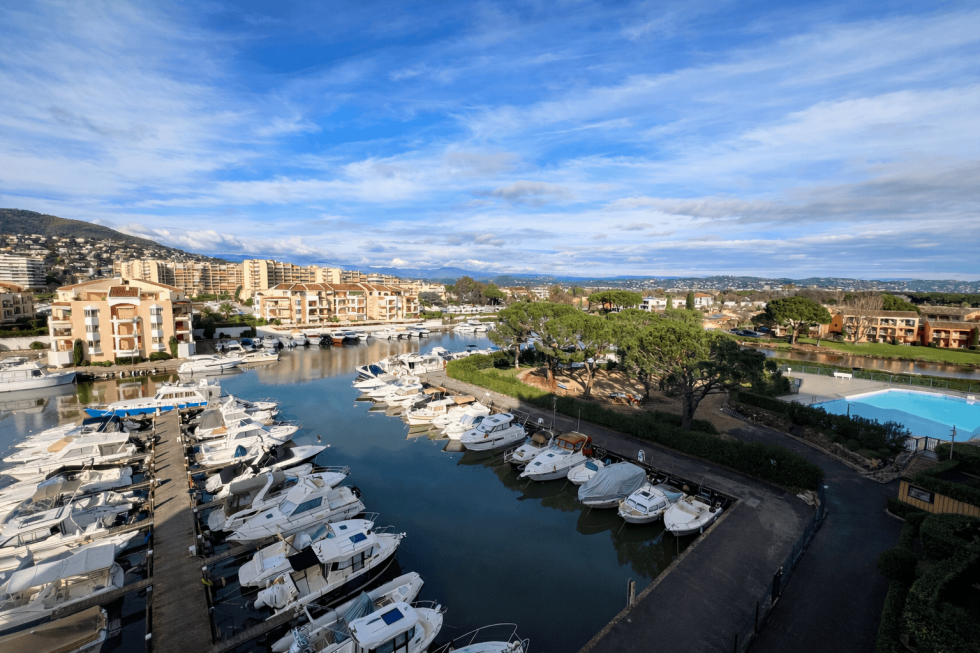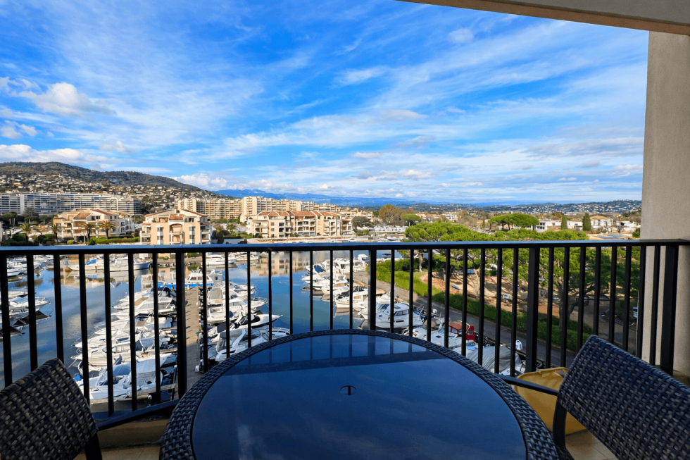 Situé au 4e étage, l’appartement s’ouvre sur une agréable terrasse offrant une vue directement sur la Marina. Depuis votre extérieur, vous profitez d’une vue dégagée sur le port et les bateaux, un environnement rare qui évoque immédiatement la douceur de vie de la Côte d’Azur.
