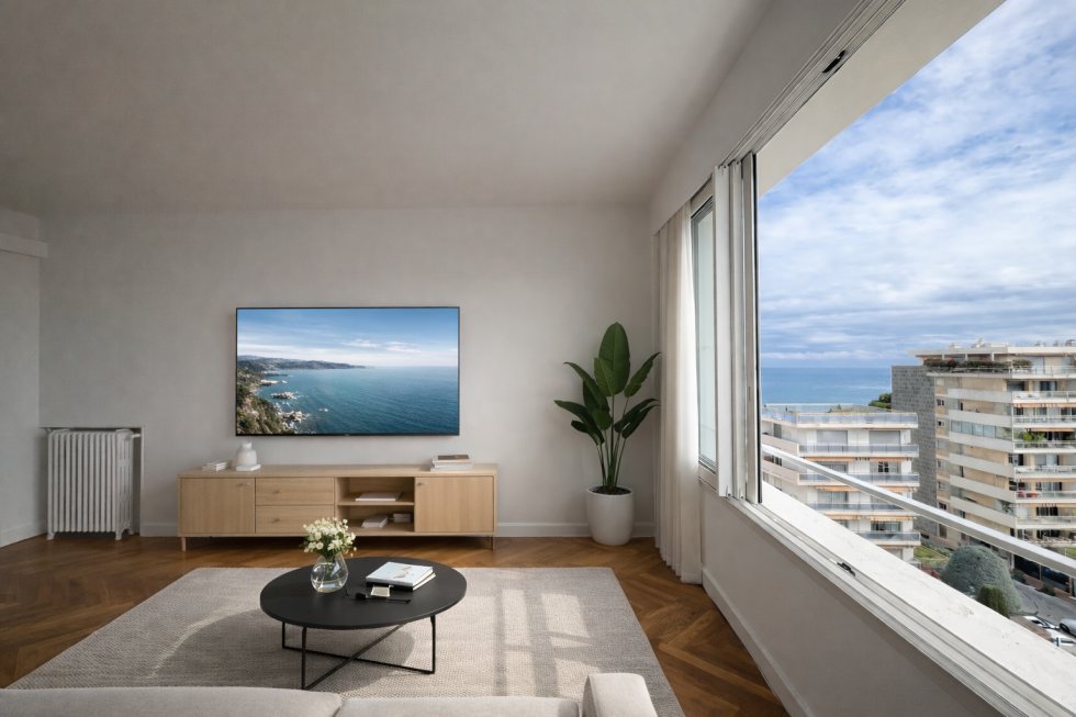 Entièrement rénové avec goût et prestations de qualité, cet appartement traversant bénéficie d’une belle luminosité. Le séjour exposé plein sud s’ouvre sur une vue dégagée avec aperçu mer, créant un espace de vie particulièrement agréable.